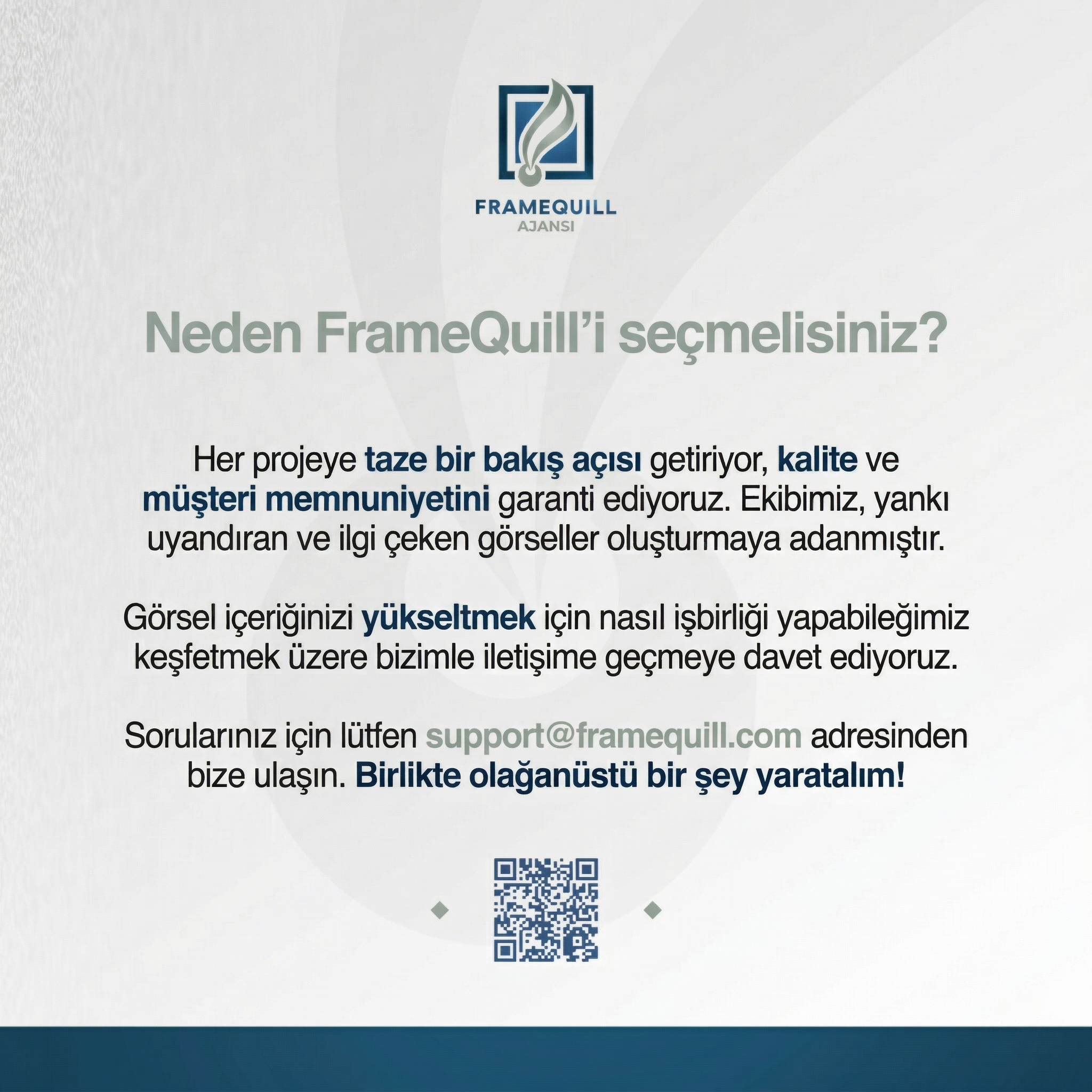 Mükemmelliğe olan bağlılığımız ve yenilikçi üretim anlayışımızla, yaratıcı fikirleri gerçeğe dönüştürmeye kendimizi adıyoruz. Deneyimli tasarım ekibimiz, yılların getirdiği birikimle ihtiyaçlarınıza özel, etkili ve kaliteli çözümler sunar.